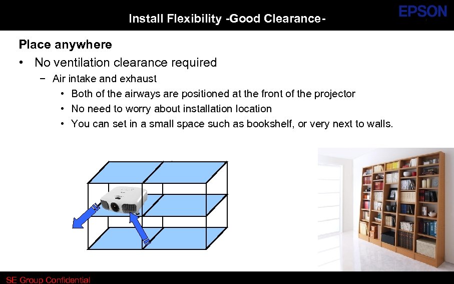 Install Flexibility -Good Clearance- Place anywhere • No ventilation clearance required − Air intake and exhaust • Both of the airways are positioned at the front of the projector • No need to worry about installation location • You can set in a small space such as bookshelf, or very next to walls. SE Group Confidential