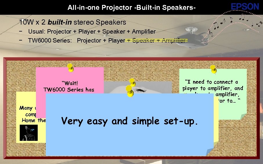 All-in-one Projector -Built-in Speakers- 10 W x 2 built-in stereo Speakers − Usual: Projector + Player + Speaker + Amplifier − TW 6000 Series: Projector + Player + Speaker + Amplifier “Wait! TW 6000 Series has stereo speakers!” Many users are annoyed complicated set up Home theater system. “I need to connect a player to amplifier, and speakers to amplifier, and a projector to… “ Very easy and simple “Wireless HD also!” set-up. SE Group Confidential