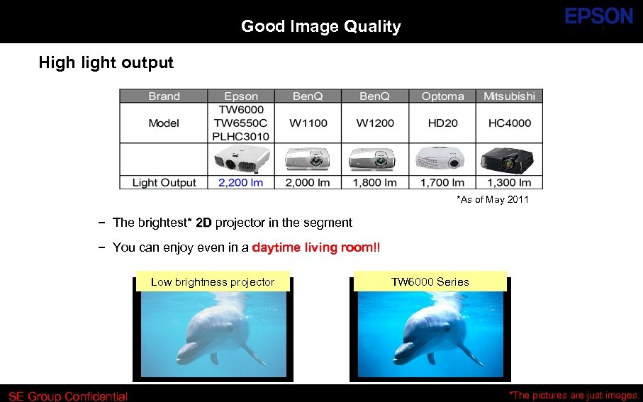 Good Image Quality High light output *As of May 2011 − The brightest* 2 D projector in the segment − You can enjoy even in a daytime living room!! room Low brightness projector SE Group Confidential TW 6000 Series *The pictures are just images.