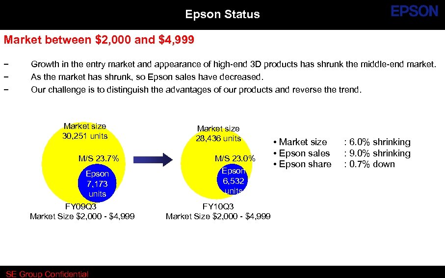 Epson Status Market between $2, 000 and $4, 999 − − − Growth in the entry market and appearance of high-end 3 D products has shrunk the middle-end market. As the market has shrunk, so Epson sales have decreased. Our challenge is to distinguish the advantages of our products and reverse the trend. Market size 30, 251 units M/S 23. 7% Epson 7, 173 units FY 09 Q 3 Market Size $2, 000 - $4, 999 SE Group Confidential Market size 28, 436 units M/S 23. 0% Epson 6, 532 units FY 10 Q 3 Market Size $2, 000 - $4, 999 • Market size • Epson sales • Epson share : 6. 0% shrinking : 9. 0% shrinking : 0. 7% down