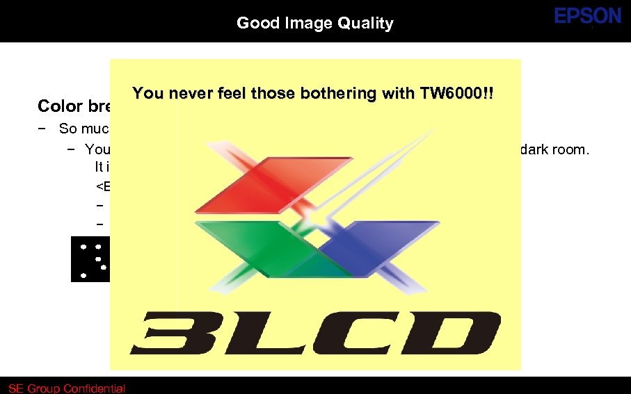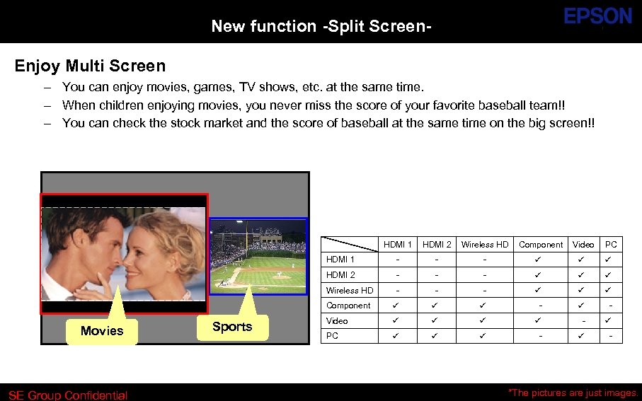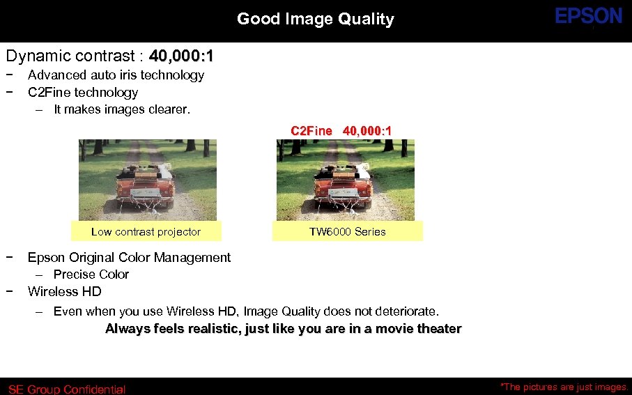 Good Image Quality Dynamic contrast : 40, 000: 1 − − Advanced auto iris technology C 2 Fine technology – It makes images clearer. C 2 Fine 40, 000: 1 Low contrast projector − − TW 6000 Series Epson Original Color Management – Precise Color Wireless HD – Even when you use Wireless HD, Image Quality does not deteriorate. Always feels realistic, just like you are in a movie theater SE Group Confidential *The pictures are just images.