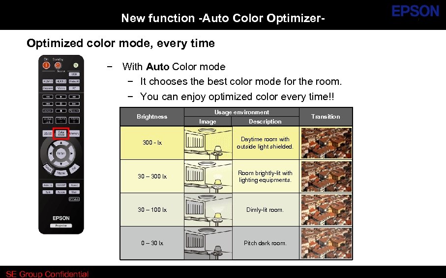 New function -Auto Color Optimizer. Optimized color mode, every time − With Auto Color mode − It chooses the best color mode for the room. − You can enjoy optimized color every time!! Brightness Usage environment Image Description 300 - lx 30 – 300 lx Room brightly-lit with lighting equipments. 30 – 100 lx Dimly-lit room. 0 – 30 lx SE Group Confidential Daytime room with outside light shielded. Pitch dark room. Transition
