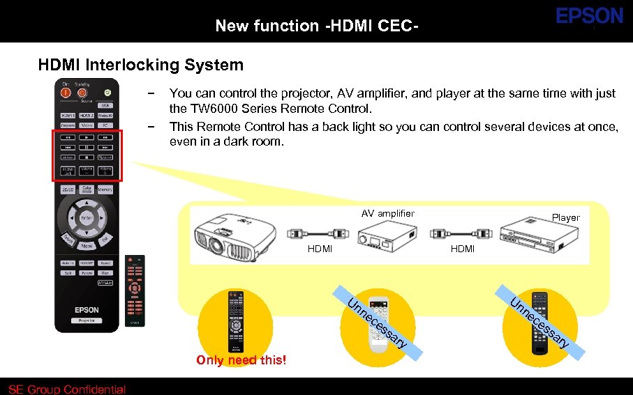 New function -HDMI CECHDMI Interlocking System − − You can control the projector, AV amplifier, and player at the same time with just the TW 6000 Series Remote Control. This Remote Control has a back light so you can control several devices at once, even in a dark room. AV amplifier HDMI Un ne Only need this! SE Group Confidential Player ce Un ss ar y ne ce ss ar y
