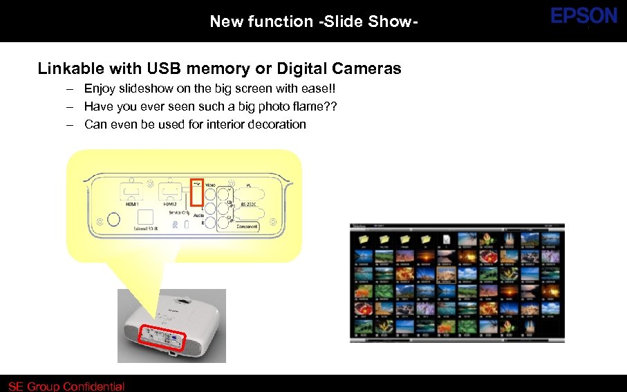 New function -Slide Show. Linkable with USB memory or Digital Cameras – Enjoy slideshow on the big screen with ease!! – Have you ever seen such a big photo flame? ? – Can even be used for interior decoration SE Group Confidential