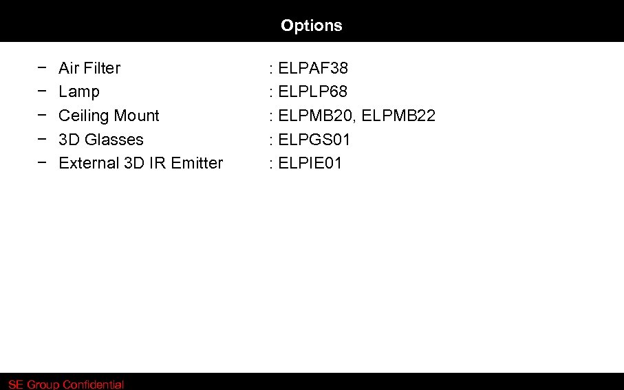 Options − − − Air Filter Lamp Ceiling Mount 3 D Glasses External 3 D IR Emitter SE Group Confidential : ELPAF 38 : ELPLP 68 : ELPMB 20, ELPMB 22 : ELPGS 01 : ELPIE 01