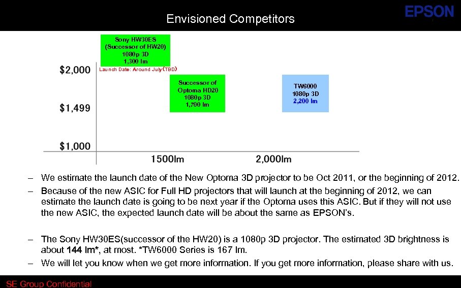 Envisioned Competitors Sony HW 30 ES (Successor of HW 20) 1080 p 3 D 1, 300 lm Launch Date: Around July(TBD) Successor of Optoma HD 20 1080 p 3 D 1, 700 lm TW 6000 1080 p 3 D 2, 200 lm – We estimate the launch date of the New Optoma 3 D projector to be Oct 2011, or the beginning of 2012. – Because of the new ASIC for Full HD projectors that will launch at the beginning of 2012, we can estimate the launch date is going to be next year if the Optoma uses this ASIC. But if they will not use the new ASIC, the expected launch date will be about the same as EPSON’s. – The Sony HW 30 ES(successor of the HW 20) is a 1080 p 3 D projector. The estimated 3 D brightness is about 144 lm*, at most. *TW 6000 Series is 167 lm. – We will let you know when we get more information. If you get more information, please share with us. SE Group Confidential