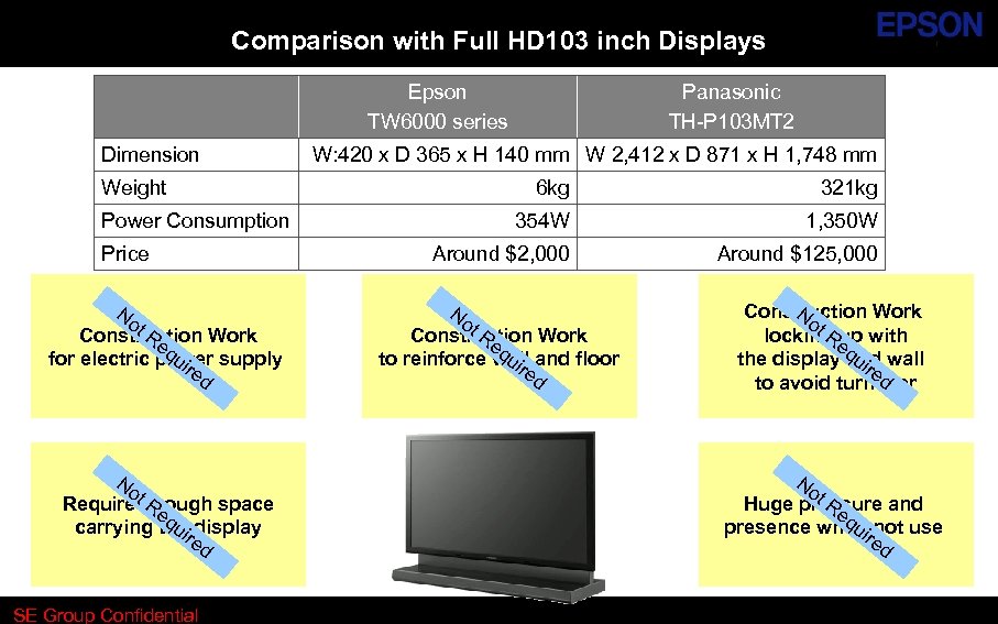 Comparison with Full HD 103 inch Displays Epson TW 6000 series Dimension Weight Power Consumption Price No t. R Construction Work eq uir for electric power supply ed No Re Requiret enough space qu carrying the display ire d SE Group Confidential Panasonic TH-P 103 MT 2 W: 420 x D 365 x H 140 mm W 2, 412 x D 871 x H 1, 748 mm 6 kg 321 kg 354 W 1, 350 W Around $2, 000 Around $125, 000 No t. R Construction Work eq uir to reinforce wall and floor ed No Construction Work t R up locking e with the display quir wall and ed to avoid turnover No t. R Huge pressure and eq ui presence whenr not use ed