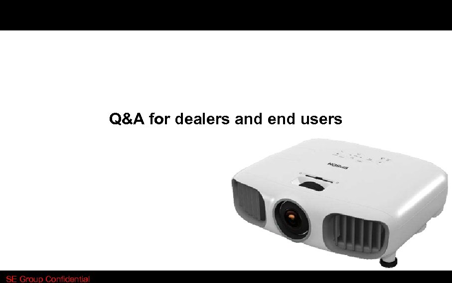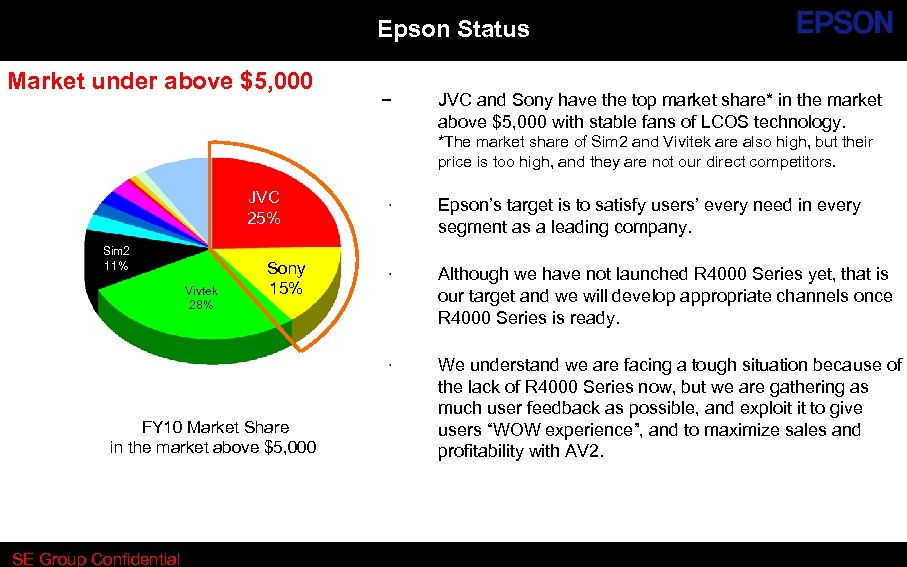 Epson Status Market under above $5, 000 − JVC and Sony have the top market share* in the market above $5, 000 with stable fans of LCOS technology. *The market share of Sim 2 and Vivitek are also high, but their price is too high, and they are not our direct competitors. JVC 25% Vivtek 28% Sony 15% FY 10 Market Share in the market above $5, 000 SE Group Confidential Epson’s target is to satisfy users’ every need in every segment as a leading company. − Although we have not launched R 4000 Series yet, that is our target and we will develop appropriate channels once R 4000 Series is ready. − Sim 2 11% − We understand we are facing a tough situation because of the lack of R 4000 Series now, but we are gathering as much user feedback as possible, and exploit it to give users “WOW experience”, and to maximize sales and profitability with AV 2.