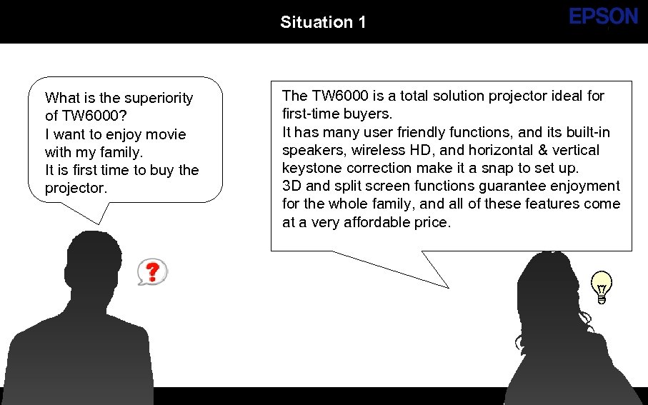 Situation 1 What is the superiority of TW 6000? I want to enjoy movie with my family. It is first time to buy the projector. SE Group Confidential The TW 6000 is a total solution projector ideal for first-time buyers. It has many user friendly functions, and its built-in speakers, wireless HD, and horizontal & vertical keystone correction make it a snap to set up. 3 D and split screen functions guarantee enjoyment for the whole family, and all of these features come at a very affordable price.