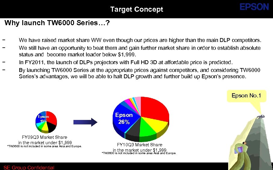 Target Concept Why launch TW 6000 Series…? − − We have raised market share WW even though our prices are higher than the main DLP competitors. We still have an opportunity to beat them and gain further market share in order to establish absolute status and become market leader below $1, 999. In FY 2011, the launch of DLPs projectors with Full HD 3 D at affordable price is predicted. By launching TW 6000 Series at the appropriate prices against competitors, and considering TW 6000 Series’s advantages, we will be able to halt DLP growth and further build up Epson’s presence. Epson No. 1 Epson 19% FY 09 Q 3 Market Share in the market under $1, 999 *TW 3600 is not included in some area Asia and Europe. Epson 26% FY 10 Q 3 Market Share in the market under $1, 999 *TW 3600 is not included in some area Asia and Europe. SE Group Confidential