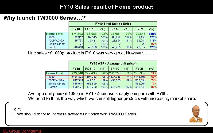 FY 10 Sales result of Home product Why launch TW 9000 Series…? Unit sales of 1080 p product in FY 10 was very good, However………. Average unit price of 1080 p in FY 10 decrease sharply compare with FY 09. We need to think the way which we can sell higher products with increasing market share. Point 1. We should to try to increase average unit price with TW 9000 Series. SE Group Confidential