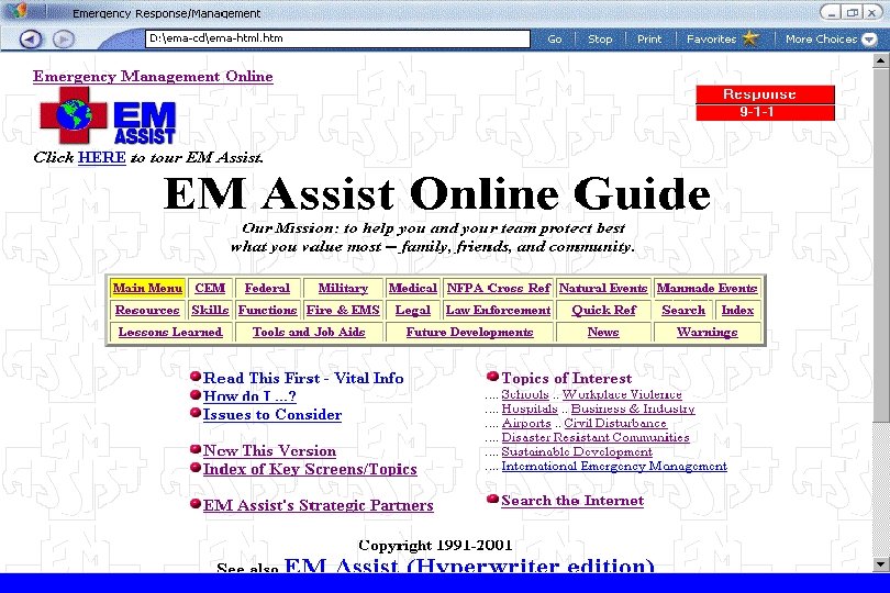 Online EM Assist Organization ä Detailed information concerning the incident command system (ICS) and mitigation, preparedness, response, and recovery actions ä Extensive special topics area covering schools, hospitals, airports, international emergency management ä Well-organized case studies ä Detailed examples of best practices