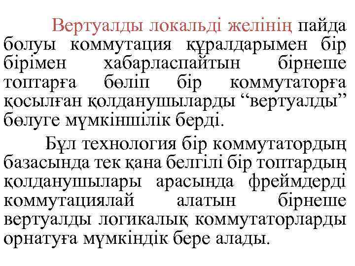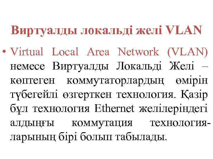 Виртуалды локальді желі VLAN • Virtual Local Area Network (VLAN) немесе Виртуалды Локальді Желі – көптеген коммутаторлардың өмірін түбегейлі өзгерткен технология. Қазір бұл технология Ethernet желілеріндегі алдыңғы коммутация технологияларының бірі болып табылады.