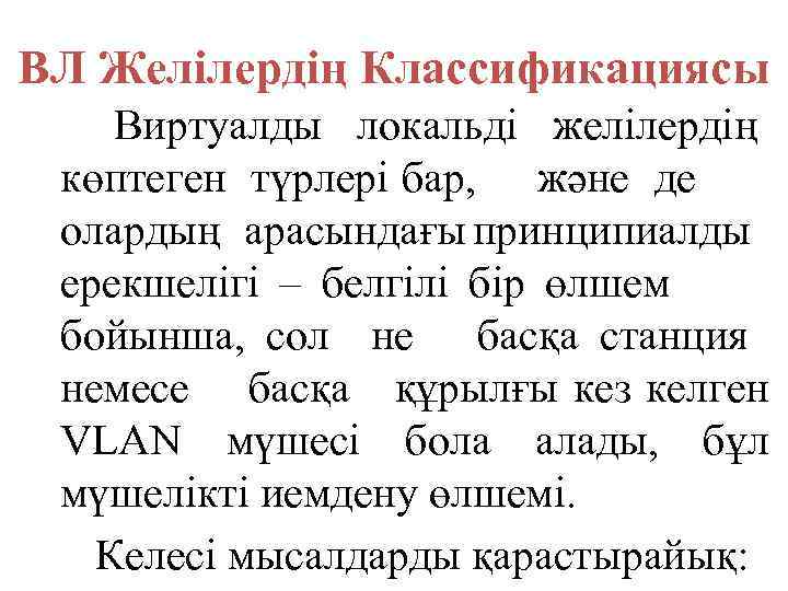 ВЛ Желілердің Классификациясы Виртуалды локальді желілердің көптеген түрлері бар, және де олардың арасындағы принципиалды ерекшелігі – белгілі бір өлшем бойынша, cол не басқа станция немесе басқа құрылғы кез келген VLAN мүшесі бола алады, бұл мүшелікті иемдену өлшемі. Келесі мысалдарды қарастырайық: