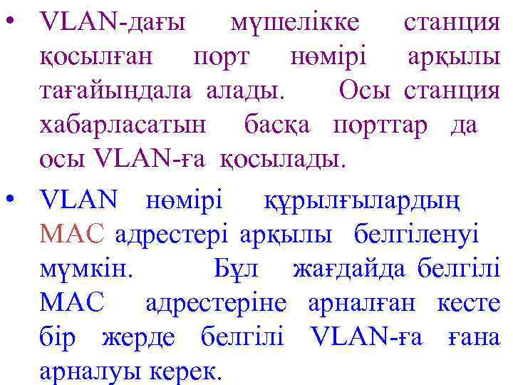 • VLAN-дағы мүшелікке станция қосылған порт нөмірі арқылы тағайындала алады. Осы станция хабарласатын басқа порттар да осы VLAN-ға қосылады. • VLAN нөмірі құрылғылардың МАС адрестері арқылы белгіленуі мүмкін. Бұл жағдайда белгілі МАС адрестеріне арналған кесте бір жерде белгілі VLAN-ға ғана арналуы керек.