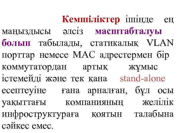 Кемшіліктер ішінде ең маңыздысы әлсіз масштабталуы болып табылады, статикалық VLAN порттар немесе МАС адрестермен бір коммутатордан артық жұмыс істемейді және тек қана stand-alone есептеуіне ғана арналған, бұл осы уақыттағы компанияның желілік инфроструктураға қоятын талабына сәйкес емес.
