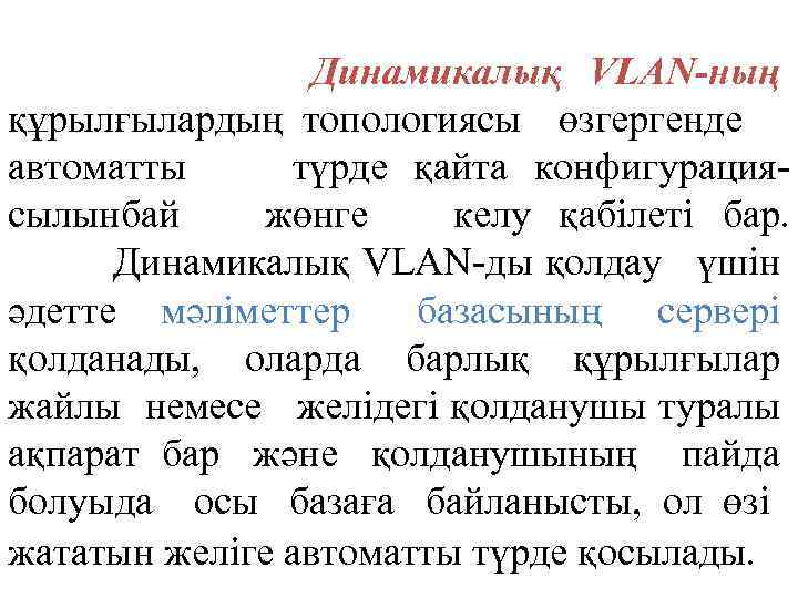 • VLAN-ның сирек, бірақ маңызды түрлерінің бірі болып VLAN-ға құрылғы жіберетін трафик бойынша қосылатын желі. • VLAN-ға тиісті логин мен пароль бойынша, бизнесрольдер және тағы басқа да қолданушылар сипаттамаларымен қосылу, ешқандай да жұмыс станциясына байланысы жоқ, бұл қазір дамып келе жатқан бағыт.