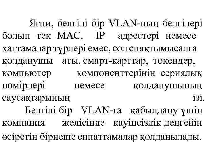 Яғни, белгілі бір VLAN-ның белгілері болып тек МАС, IP адрестері немесе хаттамалар түрлері емес, сол сияқтымысалға қолданушы аты, смарт-карттар, токендер, компьютер компоненттерінің сериялық нөмірлері немесе қолданушының саусақтарының ізі. Белгілі бір VLAN-ға қабылдану үшін компания желісінде қауіпсіздік деңгейін өсіретін бірнеше сипаттамалар қолданылады.