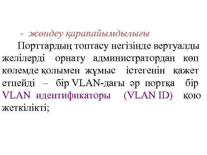 - жөндеу қарапайымдылығы Порттардың топтасу негізінде вертуалды желілерді орнату администратордан көп көлемде қолымен жұмыс істегенін қажет етпейді – бір VLAN-дағы әр портқа бір VLAN идентификаторы (VLAN ID) қою жеткілікті;