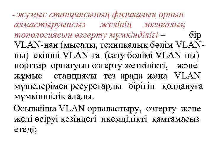 - жұмыс станциясының физикалық орнын алмастыруынсыз желінің логикалық топологиясын өзгерту мүмкінділігі – бір VLAN-нан (мысалы, техникалық бөлім VLANны) екінші VLAN-ға (сату бөлімі VLAN-ны) порттар орнатуын өзгерту жеткілікті, және жұмыс станциясы тез арада жаңа VLAN мүшелерімен ресурстарды бірігіп қолдануға мүмкіншілік алады. Осылайша VLAN орналастыру, өзгерту және желі өсіруі кезіндегі икемділікті қамтамасыз етеді;