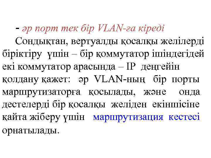 - әр порт тек бір VLAN-ға кіреді Сондықтан, вертуалды қосалқы желілерді біріктіру үшін – бір қоммутатор ішіндегідей екі коммутатор арасында – IP деңгейін қолдану қажет: әр VLAN-ның бір порты маршрутизаторға қосылады, және онда дестелерді бір қосалқы желіден екіншісіне қайта жіберу үшін маршрутизация кестесі орнатылады.