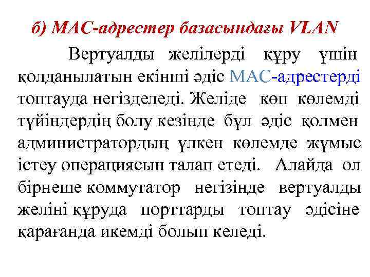 б) MAC-адрестер базасындағы VLAN Вертуалды желілерді құру үшін қолданылатын екінші әдіс МАС-адрестерді топтауда негізделеді. Желіде көп көлемді түйіндердің болу кезінде бұл әдіс қолмен администратордың үлкен көлемде жұмыс істеу операциясын талап етеді. Алайда ол бірнеше коммутатор негізінде вертуалды желіні құруда порттарды топтау әдісіне қарағанда икемді болып келеді.