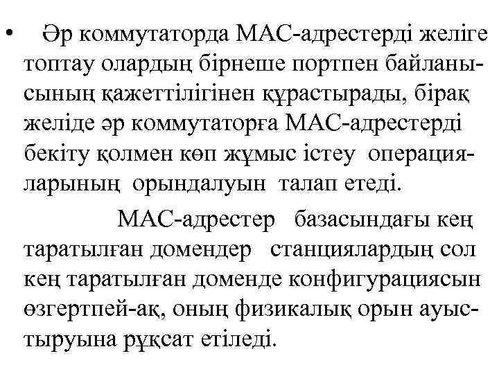 Коммутаторлардың қосымша функцииялары • Порттарды біріктіру – Trunking; • SNMP – басқару; • Port Security функциясын қамтамасыз ету, немесе MAC-адресті белгілі бір портқа бекіту; • 802. 1 х стандартын қолдау; • Топтық тарату; • Мәлімет ағындарын баскару ж. т. б.
