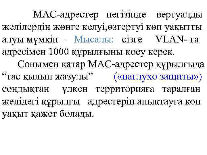 МАС-адрестер негізінде вертуалды желілердің жөнге келуі, өзгертуі көп уақытты алуы мүмкін – Мысалы: сізге VLAN- ға адресімен 1000 құрылғыны қосу керек. Сонымен қатар MAC-адрестер құрылғыда “тас қылып жазулы” ( «наглухо защиты» ) сондықтан үлкен территорияға таралған желідегі құрылғы адрестерін анықтауға көп уақыт қажет болады.