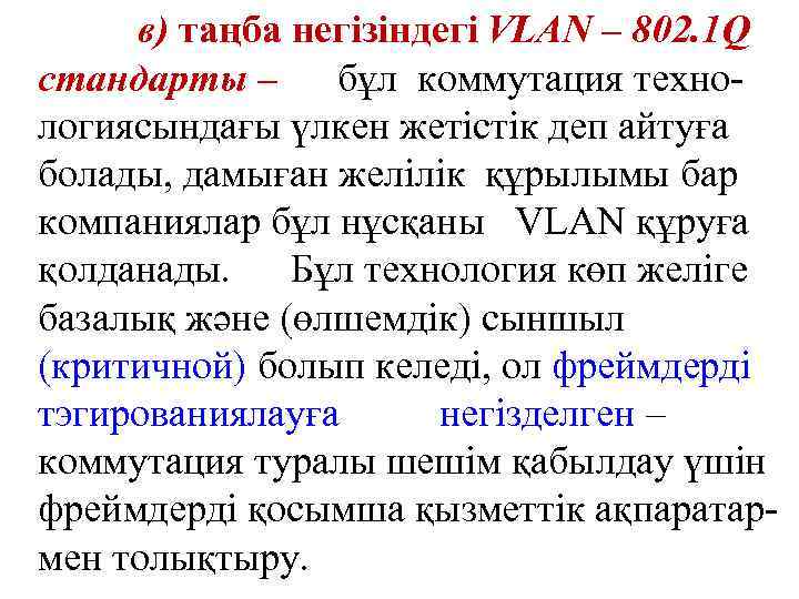 в) таңба негізіндегі VLAN – 802. 1 Q стандарты – бұл коммутация технологиясындағы үлкен жетістік деп айтуға болады, дамыған желілік құрылымы бар компаниялар бұл нұсқаны VLAN құруға қолданады. Бұл технология көп желіге базалық және (өлшемдік) сыншыл (критичной) болып келеді, ол фреймдерді тэгированиялауға негізделген – коммутация туралы шешім қабылдау үшін фреймдерді қосымша қызметтік ақпаратармен толықтыру.