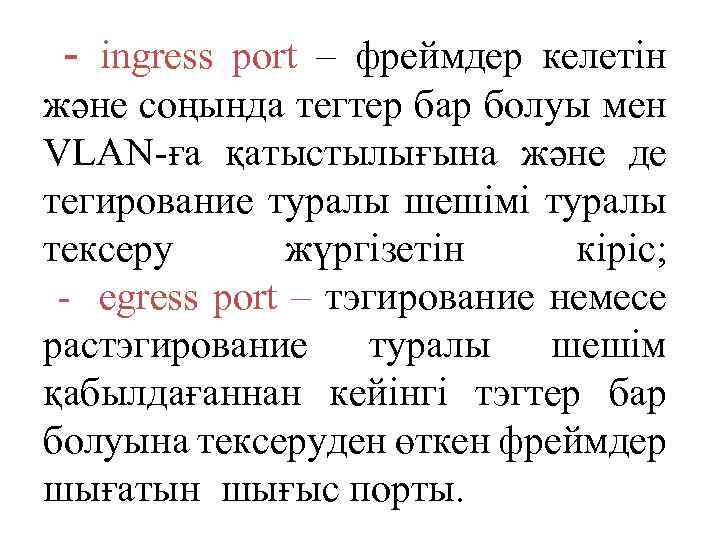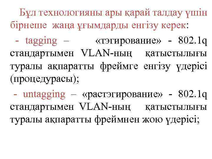 Бұл технологияны ары қарай талдау үшін бірнеше жаңа ұғымдарды енгізу керек: - tagging – «тэгирование» - 802. 1 q стандартымен VLAN-ның қатыстылығы туралы ақпаратты фреймге енгізу үдерісі (процедурасы); - untagging – «растэгирование» - 802. 1 q стандартымен VLAN-ның қатыстылығы туралы ақпаратты фреймнен жою үдерісі;