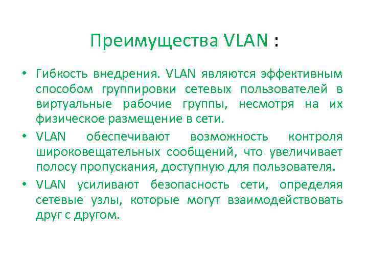 Преимущества VLAN : • Гибкость внедрения. VLAN являются эффективным способом группировки сетевых пользователей в виртуальные рабочие группы, несмотря на их физическое размещение в сети. • VLAN обеспечивают возможность контроля широковещательных сообщений, что увеличивает полосу пропускания, доступную для пользователя. • VLAN усиливают безопасность сети, определяя сетевые узлы, которые могут взаимодействовать друг с другом.