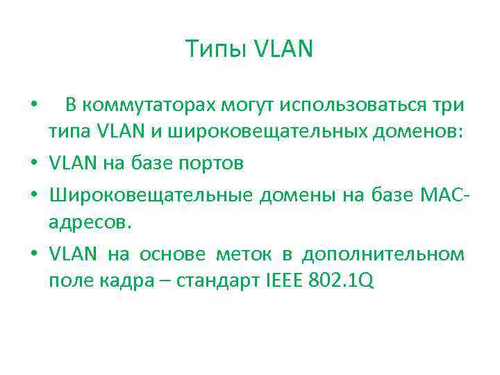 Типы VLAN В коммутаторах могут использоваться три типа VLAN и широковещательных доменов: • VLAN на базе портов • Широковещательные домены на базе MACадресов. • VLAN на основе меток в дополнительном поле кадра – стандарт IEEE 802. 1 Q •