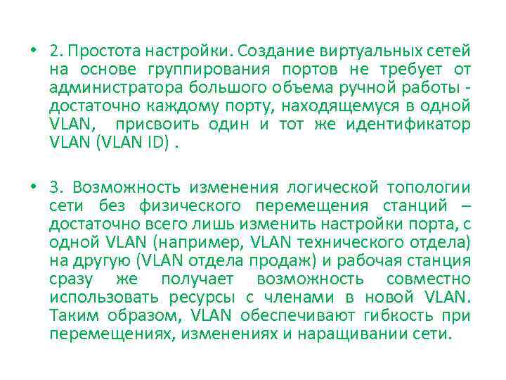 • 2. Простота настройки. Создание виртуальных сетей на основе группирования портов не требует от администратора большого объема ручной работы достаточно каждому порту, находящемуся в одной VLAN, присвоить один и тот же идентификатор VLAN (VLAN ID). • 3. Возможность изменения логической топологии сети без физического перемещения станций – достаточно всего лишь изменить настройки порта, с одной VLAN (например, VLAN технического отдела) на другую (VLAN отдела продаж) и рабочая станция сразу же получает возможность совместно использовать ресурсы с членами в новой VLAN. Таким образом, VLAN обеспечивают гибкость при перемещениях, изменениях и наращивании сети.