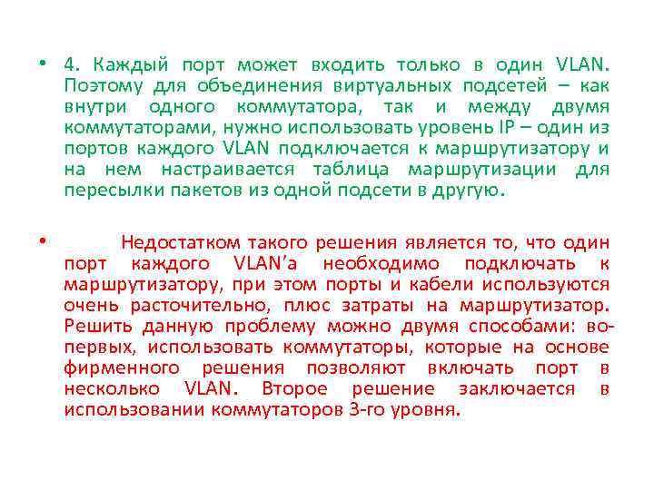 • 4. Каждый порт может входить только в один VLAN. Поэтому для объединения виртуальных подсетей – как внутри одного коммутатора, так и между двумя коммутаторами, нужно использовать уровень IP – один из портов каждого VLAN подключается к маршрутизатору и на нем настраивается таблица маршрутизации для пересылки пакетов из одной подсети в другую. • Недостатком такого решения является то, что один порт каждого VLAN’а необходимо подключать к маршрутизатору, при этом порты и кабели используются очень расточительно, плюс затраты на маршрутизатор. Решить данную проблему можно двумя способами: вопервых, использовать коммутаторы, которые на основе фирменного решения позволяют включать порт в несколько VLAN. Второе решение заключается в использовании коммутаторов 3 -го уровня.