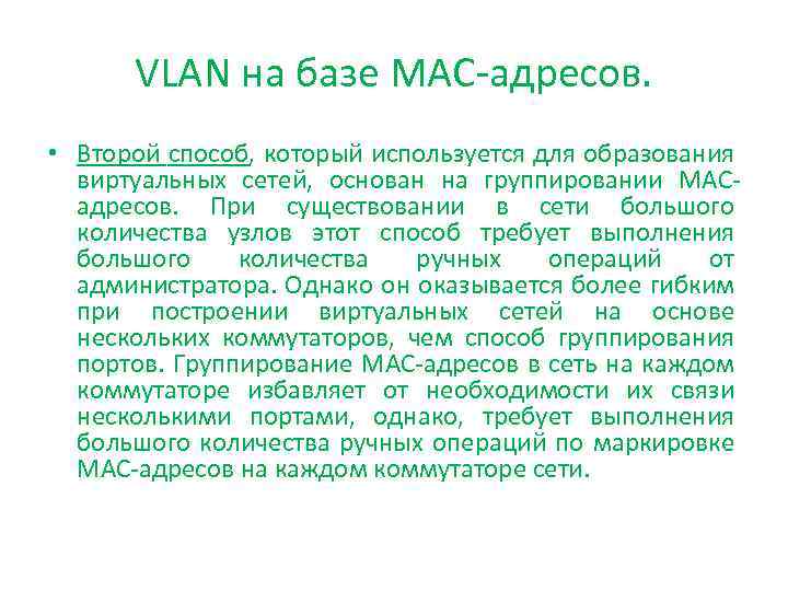 VLAN на базе MAC-адресов. • Второй способ, который используется для образования виртуальных сетей, основан на группировании МАСадресов. При существовании в сети большого количества узлов этот способ требует выполнения большого количества ручных операций от администратора. Однако он оказывается более гибким при построении виртуальных сетей на основе нескольких коммутаторов, чем способ группирования портов. Группирование МАС-адресов в сеть на каждом коммутаторе избавляет от необходимости их связи несколькими портами, однако, требует выполнения большого количества ручных операций по маркировке МАС-адресов на каждом коммутаторе сети.