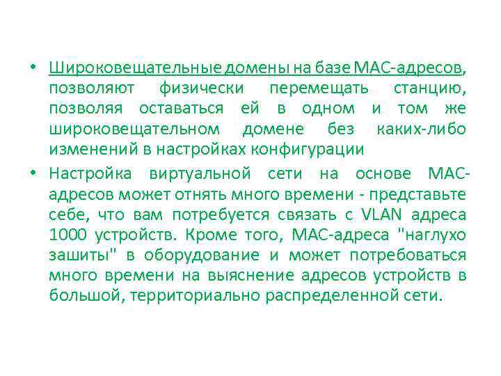 • Широковещательные домены на базе MAC-адресов, позволяют физически перемещать станцию, позволяя оставаться ей в одном и том же широковещательном домене без каких-либо изменений в настройках конфигурации • Настройка виртуальной сети на основе MACадресов может отнять много времени - представьте себе, что вам потребуется связать с VLAN адреса 1000 устройств. Кроме того, MAC-адреса "наглухо зашиты" в оборудование и может потребоваться много времени на выяснение адресов устройств в большой, территориально распределенной сети.