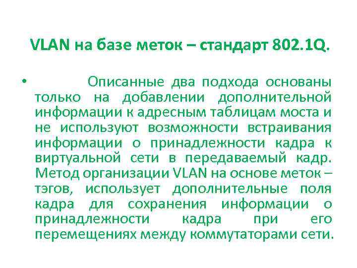 VLAN на базе меток – стандарт 802. 1 Q. • Описанные два подхода основаны только на добавлении дополнительной информации к адресным таблицам моста и не используют возможности встраивания информации о принадлежности кадра к виртуальной сети в передаваемый кадр. Метод организации VLAN на основе меток – тэгов, использует дополнительные поля кадра для сохранения информации о принадлежности кадра при его перемещениях между коммутаторами сети.
