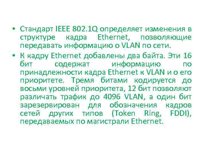 • Стандарт IEEE 802. 1 Q определяет изменения в структуре кадра Ethernet, позволяющие передавать информацию о VLAN по сети. • К кадру Ethernet добавлены два байта. Эти 16 бит содержат информацию по принадлежности кадра Ethernet к VLAN и о его приоритете. Тремя битами кодируется до восьми уровней приоритета, 12 бит позволяют различать трафик до 4096 VLAN, а один бит зарезервирован для обозначения кадров сетей других типов (Token Ring, FDDI), передаваемых по магистрали Ethernet.