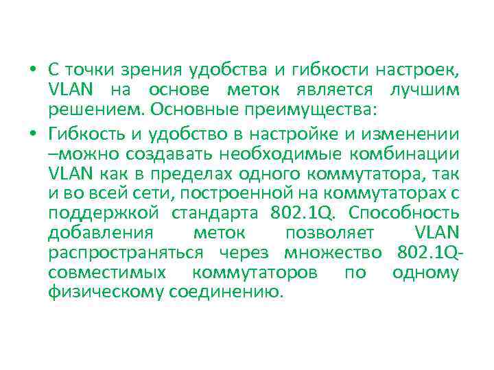 • С точки зрения удобства и гибкости настроек, VLAN на основе меток является лучшим решением. Основные преимущества: • Гибкость и удобство в настройке и изменении –можно создавать необходимые комбинации VLAN как в пределах одного коммутатора, так и во всей сети, построенной на коммутаторах с поддержкой стандарта 802. 1 Q. Способность добавления меток позволяет VLAN распространяться через множество 802. 1 Qсовместимых коммутаторов по одному физическому соединению.