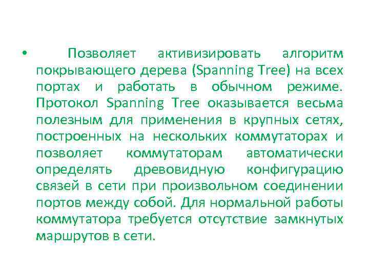 • Позволяет активизировать алгоритм покрывающего дерева (Spanning Tree) на всех портах и работать в обычном режиме. Протокол Spanning Tree оказывается весьма полезным для применения в крупных сетях, построенных на нескольких коммутаторах и позволяет коммутаторам автоматически определять древовидную конфигурацию связей в сети произвольном соединении портов между собой. Для нормальной работы коммутатора требуется отсутствие замкнутых маршрутов в сети.