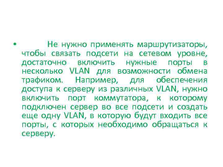 • Не нужно применять маршрутизаторы, чтобы связать подсети на сетевом уровне, достаточно включить нужные порты в несколько VLAN для возможности обмена трафиком. Например, для обеспечения доступа к серверу из различных VLAN, нужно включить порт коммутатора, к которому подключен сервер во все подсети и создать еще одну VLAN, в которую будут входить все порты, с которых необходимо обращаться к серверу.
