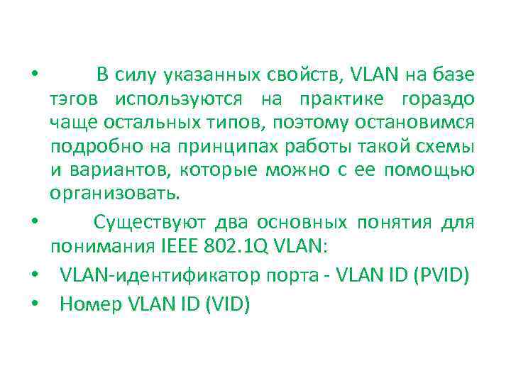 В силу указанных свойств, VLAN на базе тэгов используются на практике гораздо чаще остальных типов, поэтому остановимся подробно на принципах работы такой схемы и вариантов, которые можно с ее помощью организовать. • Существуют два основных понятия для понимания IEEE 802. 1 Q VLAN: • VLAN-идентификатор порта - VLAN ID (PVID) • Номер VLAN ID (VID) •