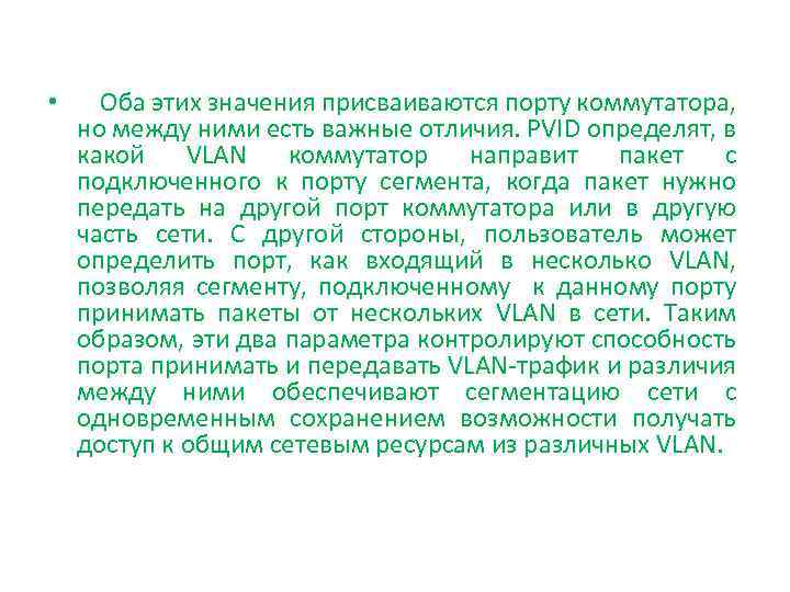 • Оба этих значения присваиваются порту коммутатора, но между ними есть важные отличия. PVID определят, в какой VLAN коммутатор направит пакет с подключенного к порту сегмента, когда пакет нужно передать на другой порт коммутатора или в другую часть сети. С другой стороны, пользователь может определить порт, как входящий в несколько VLAN, позволяя сегменту, подключенному к данному порту принимать пакеты от нескольких VLAN в сети. Таким образом, эти два параметра контролируют способность порта принимать и передавать VLAN-трафик и различия между ними обеспечивают сегментацию сети с одновременным сохранением возможности получать доступ к общим сетевым ресурсам из различных VLAN.