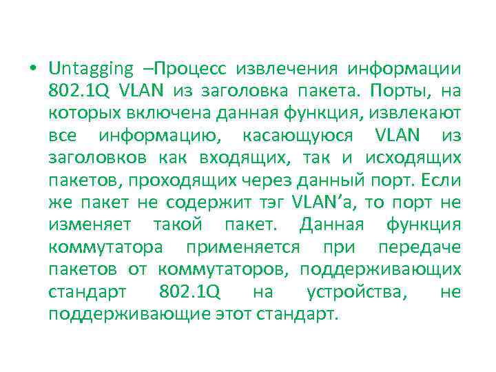 • Untagging –Процесс извлечения информации 802. 1 Q VLAN из заголовка пакета. Порты, на которых включена данная функция, извлекают все информацию, касающуюся VLAN из заголовков как входящих, так и исходящих пакетов, проходящих через данный порт. Если же пакет не содержит тэг VLAN’a, то порт не изменяет такой пакет. Данная функция коммутатора применяется при передаче пакетов от коммутаторов, поддерживающих стандарт 802. 1 Q на устройства, не поддерживающие этот стандарт.