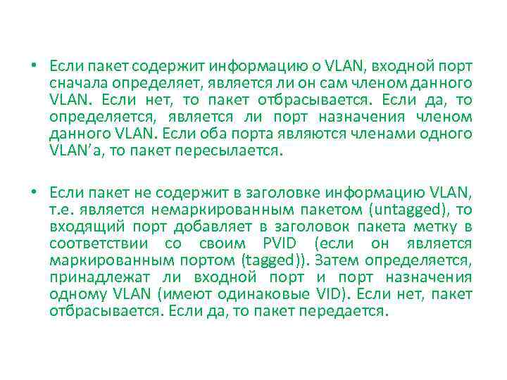 • Если пакет содержит информацию о VLAN, входной порт сначала определяет, является ли он сам членом данного VLAN. Если нет, то пакет отбрасывается. Если да, то определяется, является ли порт назначения членом данного VLAN. Если оба порта являются членами одного VLAN’а, то пакет пересылается. • Если пакет не содержит в заголовке информацию VLAN, т. е. является немаркированным пакетом (untagged), то входящий порт добавляет в заголовок пакета метку в соответствии со своим PVID (если он является маркированным портом (tagged)). Затем определяется, принадлежат ли входной порт и порт назначения одному VLAN (имеют одинаковые VID). Если нет, пакет отбрасывается. Если да, то пакет передается.