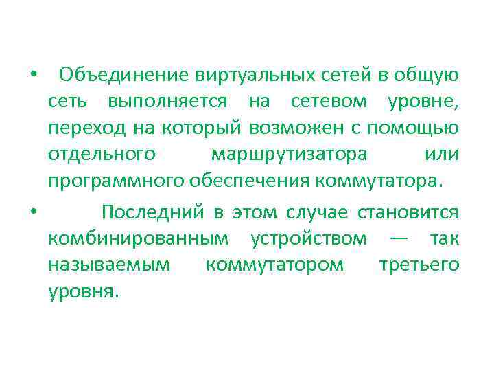 • Объединение виртуальных сетей в общую сеть выполняется на сетевом уровне, переход на который возможен с помощью отдельного маршрутизатора или программного обеспечения коммутатора. • Последний в этом случае становится комбинированным устройством — так называемым коммутатором третьего уровня.
