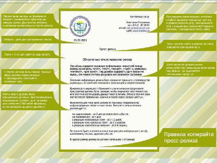 Ошибки o запоздалая информация; o не актуальная тема, повод «высосан из пальца» ; o «карамельные сопли» - в сообщении нет смысла, только эмоции; o не стоит указывать юридическое название, только то, по которому вас должна узнавать общественность; o НЕ ИСПОЛЬЗУЙТЕ Caps Lock !!!! o тексты в формате pdf; o фото в документе с текстом.