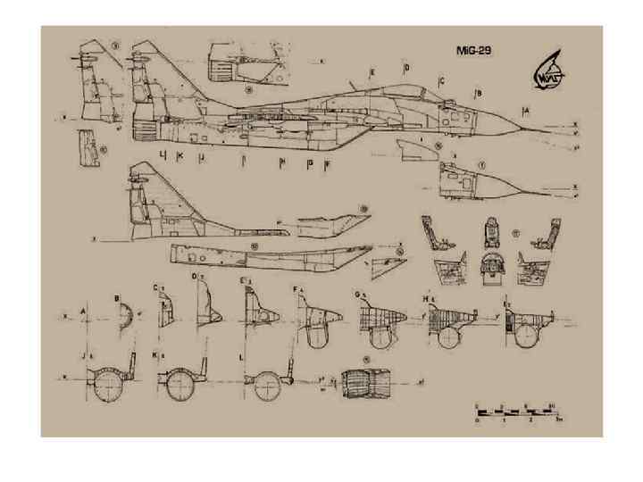 Три основных вида и дополнительный четвертый вид на чертеже военной техники.