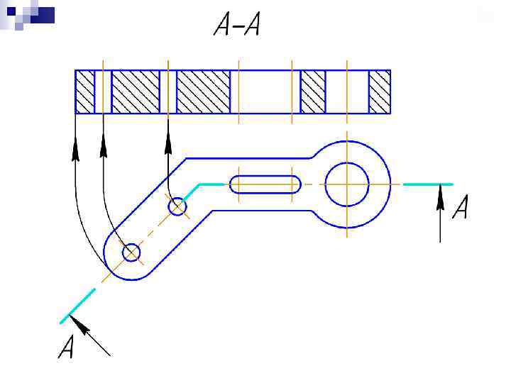 6. 5. Положение секущей плоскости указывают на чертеже линией сечения. Для линии сечения должна применяться разомкнутая линия. При сложном разрезе штрихи проводят также у мест пересечения секущих плоскостей между собой. На начальном и конечном штрихах следует ставить стрелки, указывающие направление взгляда; стрелки должны наноситься на расстоянии 2 -3 мм от конца штриха. Начальный и конечный штрихи не должны пересекать контур соответствующего изображения. 6. 6. У начала и конца линии сечения, а при необходимости и у мест пересечения секущих плоскостей ставят одну и ту же прописную букву русского алфавита. Буквы наносят около стрелок, указывающих направление взгляда, и в местах пересечения со стороны внешнего угла. Разрез должен быть отмечен надписью по типу А-А (всегда двумя буквами через тире).