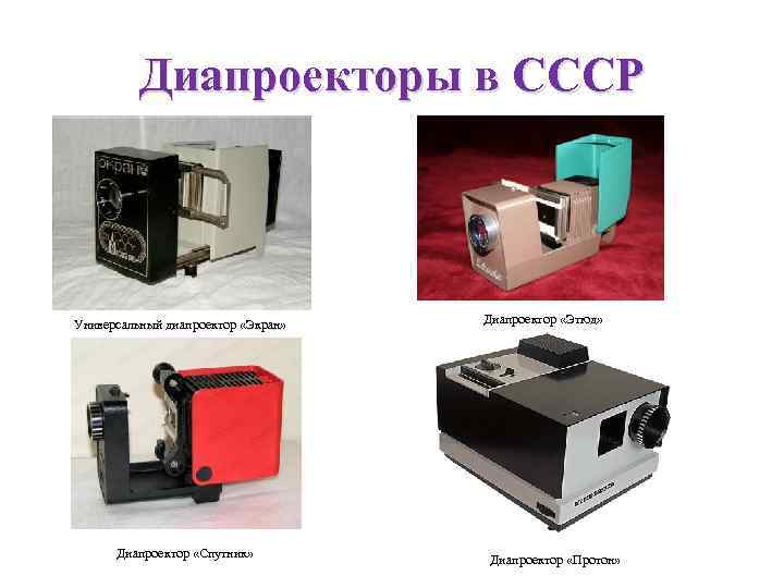 Диапроекторы в СССР Универсальный диапроектор «Экран» Диапроектор «Спутник» Диапроектор «Этюд» Диапроектор «Протон»